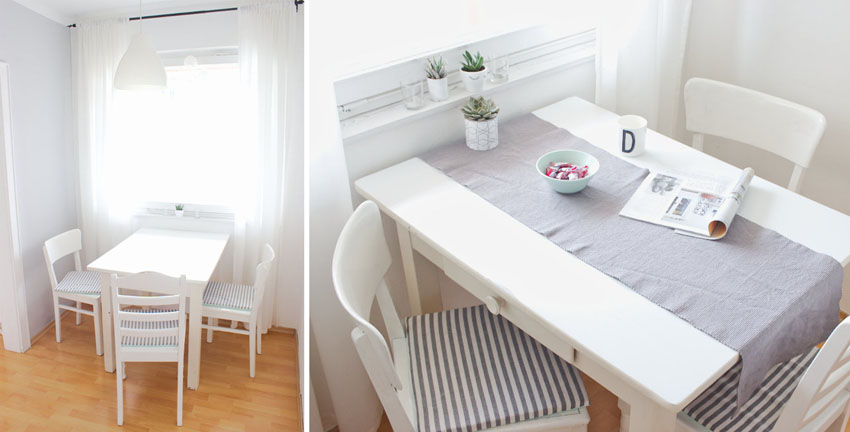Stühle weiß lackiert, einheitliche Sitzpolster genäht und schon sah alles