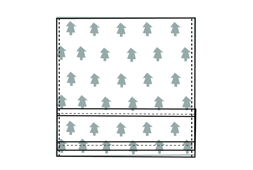 Zuerst bügelt ihr den Stoff und schneidet ihn auf die angegebenen Maße zu. Anschließend bügelt ihr beim weißen Stoff jeweils eine Kante doppelt um, sodass die offene Stoffkante in der Falz liegt und nicht zu sehen ist. Also 1 cm umklappen, bügeln und nochmal umklappen und bügeln. Dann näht ihr die umgebügelte Kante fest. Nun müssen die drei Teile zusammen genäht werden. Dazu legt zunächst den größeren weißen Stoff auf den Tannenbaumstoff. Dabei muss die offene Kante des weißen Stoffes bündig mit der oberen Kante des Tannenbaumstoffes sein. Die schönen Seiten der Stoffe müssen sich außerdem „angucken“. Nun näht ihr die obere Seite zusammen und versäubert sie mit dem Zickzackstich. Dasselbe macht ihr nun mit dem kleinen weißen Stoff an der unteren Kante des Tannenbaumstoffes.