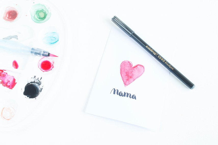 Wer in Bastellaune ist, kann natürlich auch noch schnell eine passende Muttertagskarte basteln. Besonders schnell und einfach geht es mit einer fertigen Klappkarte die ihr mit Aquarell- oder Wasserfarben bemalt. Ich stehe im Moment total auf Brushscript und habe unter mein Aquarell-Herz einfach „Mama“ mit meinem Brushpen geschrieben. Brushscript ist eigentlich gar nicht so schwer. Ihr müsst bei den Aufwärtslinien einfach nur wenig aufdrücken und bei den Abwärtslinien richtig doll. Keine Angst, der Brushpen geht davon nicht kaputt! Wenn ihr etwas mehr Zeit und Geduld habt, könnt ihr auch eine Karte zum Muttertag besticken.