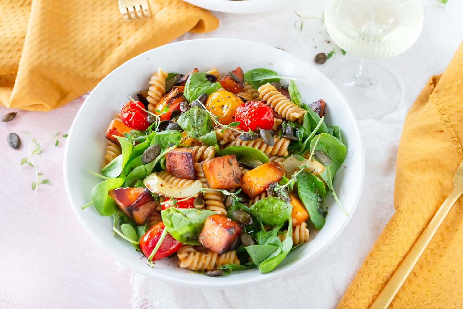 Schneidet nun die Zwiebel in Streifen und den Knoblauch in kleine Würfel. Bester beides in Olivenöl goldbraun. Gebt dann die Tomaten und die restlichen Kürbiswürfel zu und bratet sie nochmal 1-2 Minuten mit. Würzt das Ganze mit Pfeffer, Salz und Thymian und nehmt es von der Hitze. - Gießt die Nudeln ab und gebt sie zurück in den Topf. Jetzt vermischt ihr sie zuerst mit dem Kürbispüree und dann mit dem restlichen Gemüse. Zuletzt hebt ihr den Babyspinat unter.